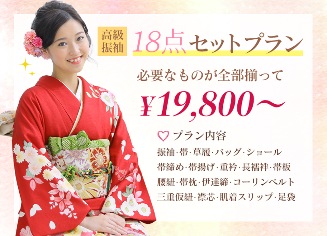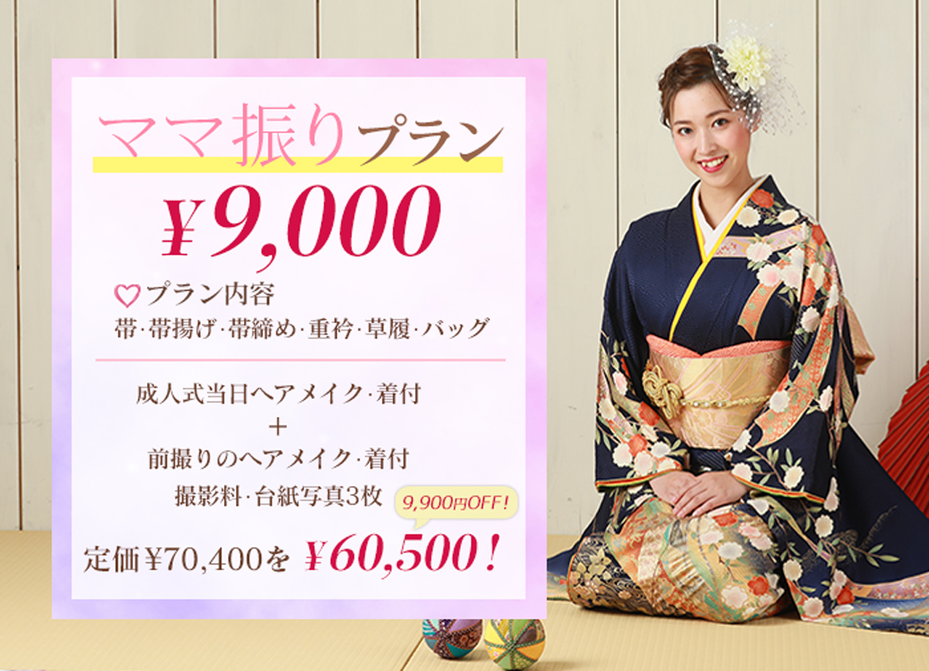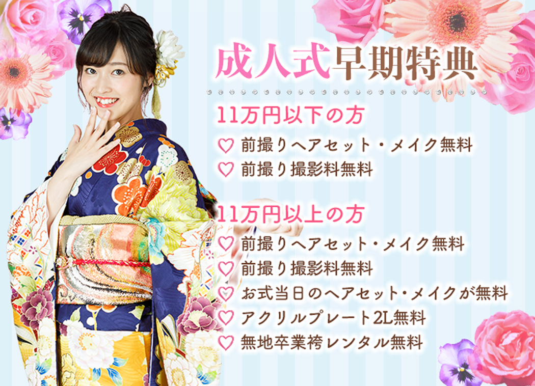 成人式や卒業式など皆さまの記念日を彩る衣裳を、より便利にご利用いただくため、お得なセットプランやプレゼントをご用意しております。また、ご愛顧いただいている客さまにはさまざまなキャンペーン特典もご用意。一定額以上の衣裳を借りたら記念写真のサービスがあるのは、写真スタジオを併設する京屋ならでは。この機会にぜひご利用ください。