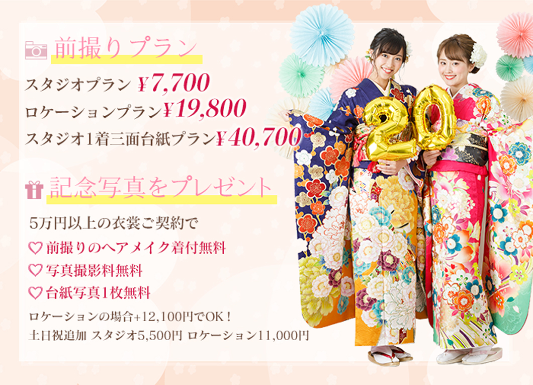 気に入った振袖や袴などを、最大で1ヶ月間お貸しすることができます。成人式だけでなくお正月も振袖でお出かけしたいという方にもおすすめです。タルご契約をいただいた方には、二十歳の記念写真をプレゼント。卒業式のフォトプランを2名以上でお申し込みの方にはグループ写真のプレゼントも行っています。